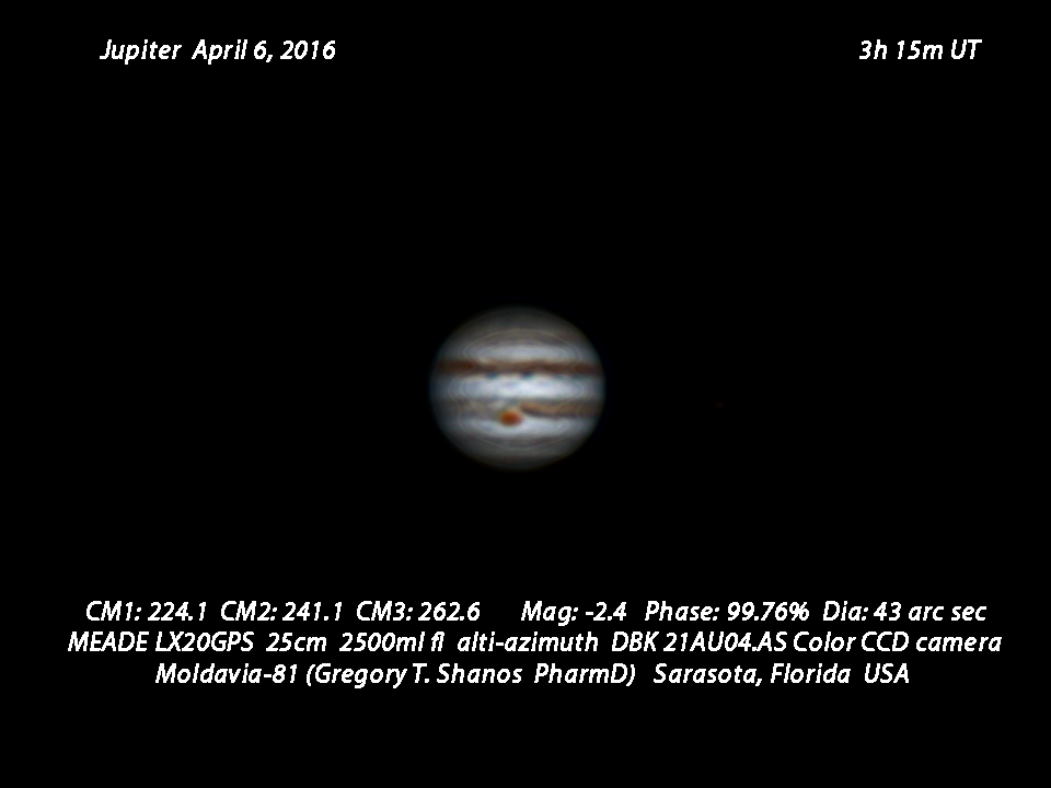Meade LX200 GPS 25cm 2500mm focal length alti-azimuth mounted . Imaging Source DBK 21AU04.AS Color CCD camera.
