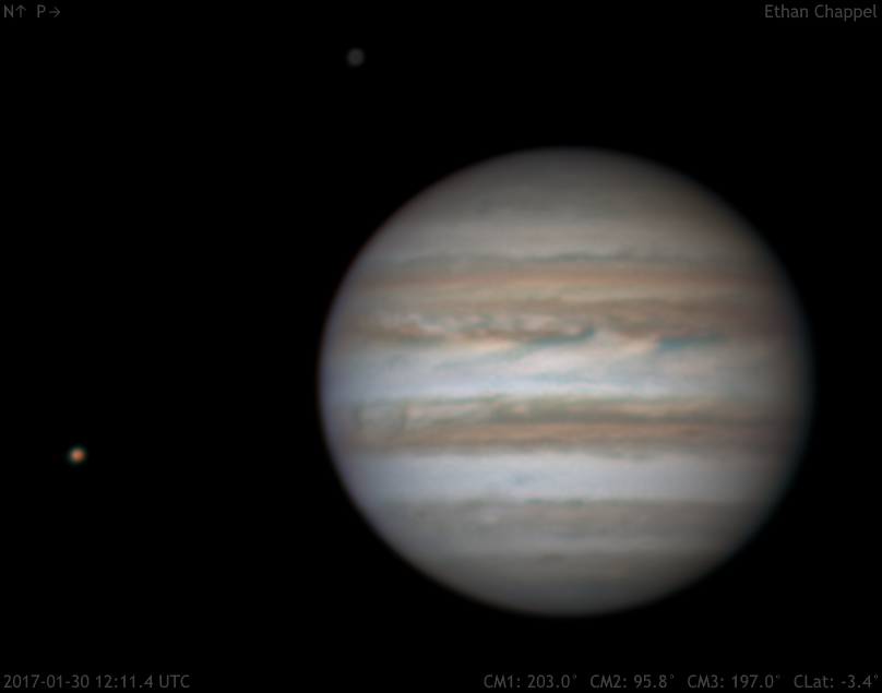 My first image in about a month and first image with the C11 in over two months! There seem to be dark marks rising on the South Equatorial Belt. There are also large outbreaks on the North Equatorial Belt. The northern edge of the North Temperate Belt looks gray. The STB Spectre is just before the Central Meridian on the South Temperate Belt. Io, having emerged from behind Jupiter not long before, and Callisto, are also nearby.