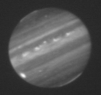 3.80-micron (L' filter) observation of Jupiter taken by the staff of NASA's Infrared Telescope Facility (IRTF) using the guide camera of the SpeX facility infrared spectrometer as a part of a program to characterize atmospheric variability in Jupiter to support the Juno mission. This filter is sensitive to sunlight reflected from clouds as deep as 1 bar, plus some additional radiation from H3+ aurora toward the poles.