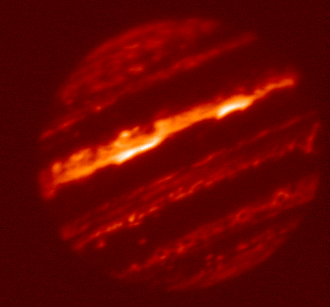 5.10-micron filtered image of Jupiter taken by the staff of NASA's Infrared Telescope Facility (IRTF) using the guide camera of the SpeX facility infrared spectrometer as a part of a program to characterize atmospheric variability in Jupiter to support the Juno mission. This filter is sensitive to very little sunlight reflected from clouds, but mostly to thermal emission from clouds as deep or deeper than the 2-3 bar pressure level. In case of "duplicate" images, this is the final version.