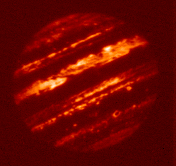 5.10-micron filtered image of Jupiter taken by the staff of NASA's Infrared Telescope Facility (IRTF) using the guide camera of the SpeX facility infrared spectrometer as a part of a program to characterize atmospheric variability in Jupiter to support the Juno mission. This filter is sensitive to very little sunlight reflected from clouds, but mostly to thermal emission from clouds as deep or deeper than the 2-3 bar pressure level. In case of "duplicate" images, this is the final version.