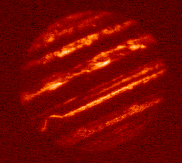 5.10-micron filtered image of Jupiter taken by the staff of NASA's Infrared Telescope Facility (IRTF) using the guide camera of the SpeX facility infrared spectrometer as a part of a program to characterize atmospheric variability in Jupiter to support the Juno mission. This filter is sensitive to very little sunlight reflected from clouds, but mostly to thermal emission from clouds as deep or deeper than the 2-3 bar pressure level. In case of "duplicate" images, this is the final version.