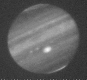 3.80-micron (L' filter) observation of Jupiter taken by the staff of NASA's Infrared Telescope Facility (IRTF) using the guide camera of the SpeX facility infrared spectrometer as a part of a program to characterize atmospheric variability in Jupiter to support the Juno mission. This filter is sensitive to sunlight reflected from clouds as deep as 1 bar, plus some additional radiation from H3+ aurora toward the poles. Image taken through cirrus.