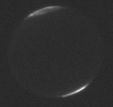 3.42-micron observation of Jupiter taken by the staff of NASA's Infrared Telescope Facility (IRTF) using the guide camera of the SpeX facility infrared spectrometer as a part of a program to characterize atmospheric variability in Jupiter to support the Juno mission. This wavelength isolates auroral emission from lines of H3+ in Jupiter's thermosphere. Image taken through cirrus.