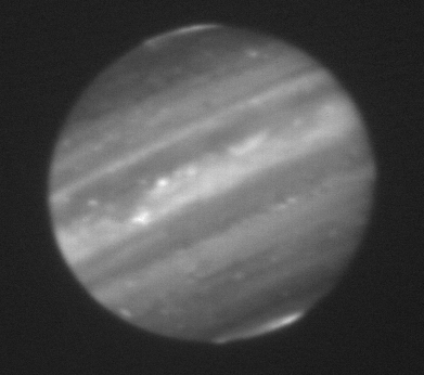 3.80-micron (L' filter) observation of Jupiter taken by the staff of NASA's Infrared Telescope Facility (IRTF) using the guide camera of the SpeX facility infrared spectrometer as a part of a program to characterize atmospheric variability in Jupiter to support the Juno mission. This filter is sensitive to sunlight reflected from clouds as deep as 1 bar, plus some additional radiation from H3+ aurora toward the poles.