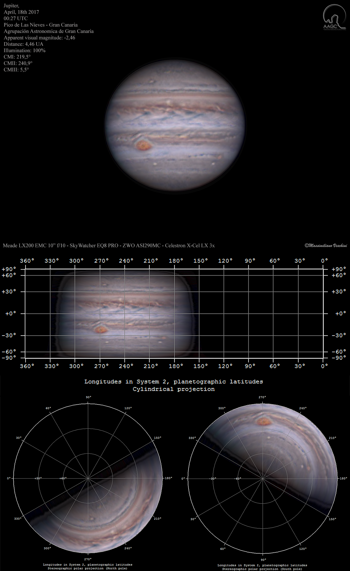Image taken by Massimiliano Veschini during a quite good night at the AAGC-Agrupación Astronómica de Gran Canaria. The GRS and the Oval BA are nicely resolved. Cylindrical and Stereographic polar projection added using WinJupos.