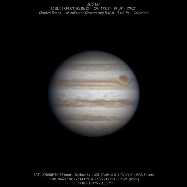 Jupiter image on 29-Nov-2015 under fair seeing. The Great Red Spot shows a deep red color, with a darker center, and disturbances behind of the GRS. SCT LX200UHTC 254mm + Barlow 2x + ASI120MM @ 0.11”/pixel (f/27) RGB: 2662/3281/2314 frames @ 22/27/19 fps – DeRot (8min) S: 6/10 – T: 4/5 – Alt: 71°