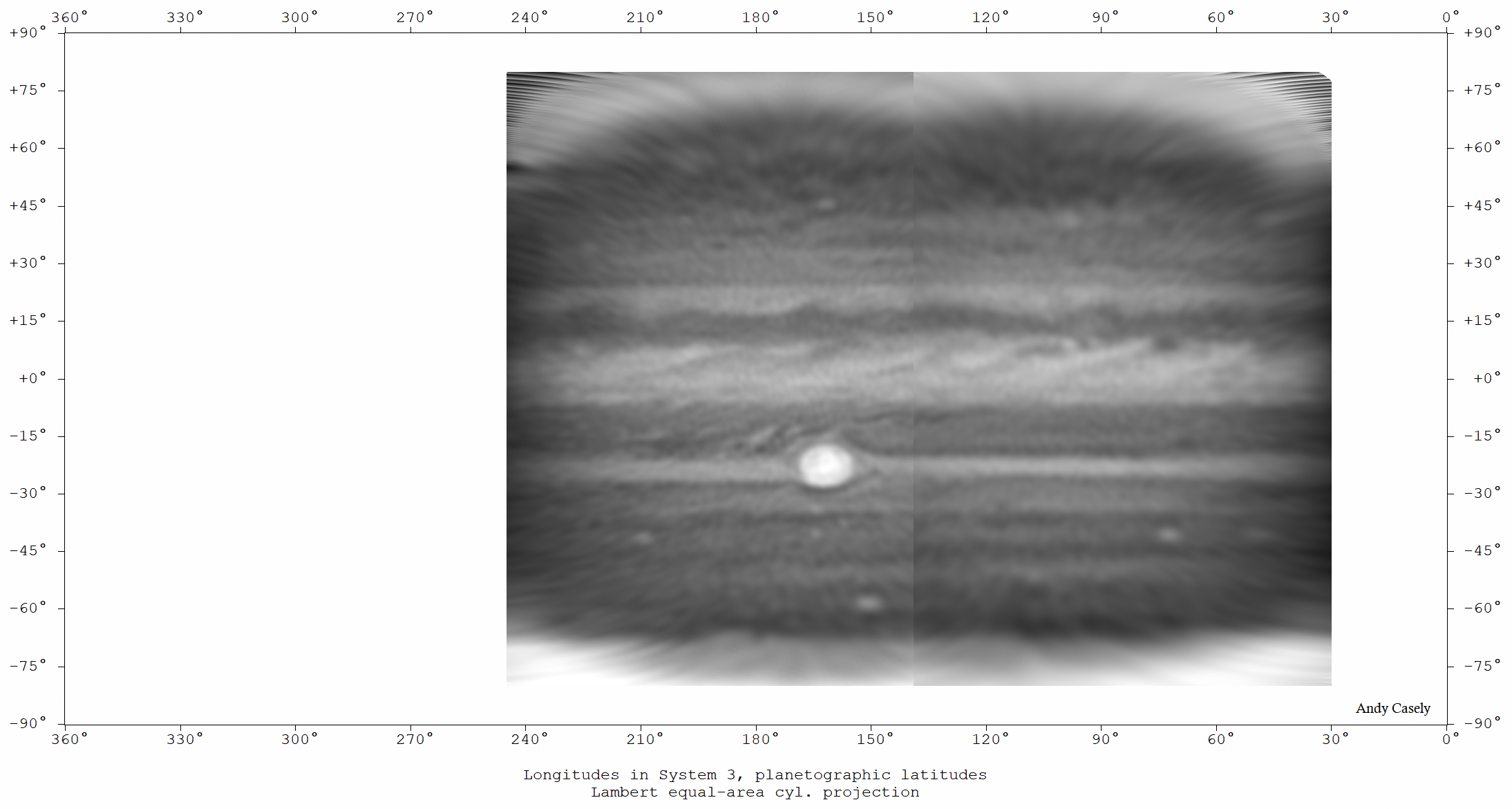 Equirectangular map in methane from two images, 11:59 & 13:45UT, fair seeing.