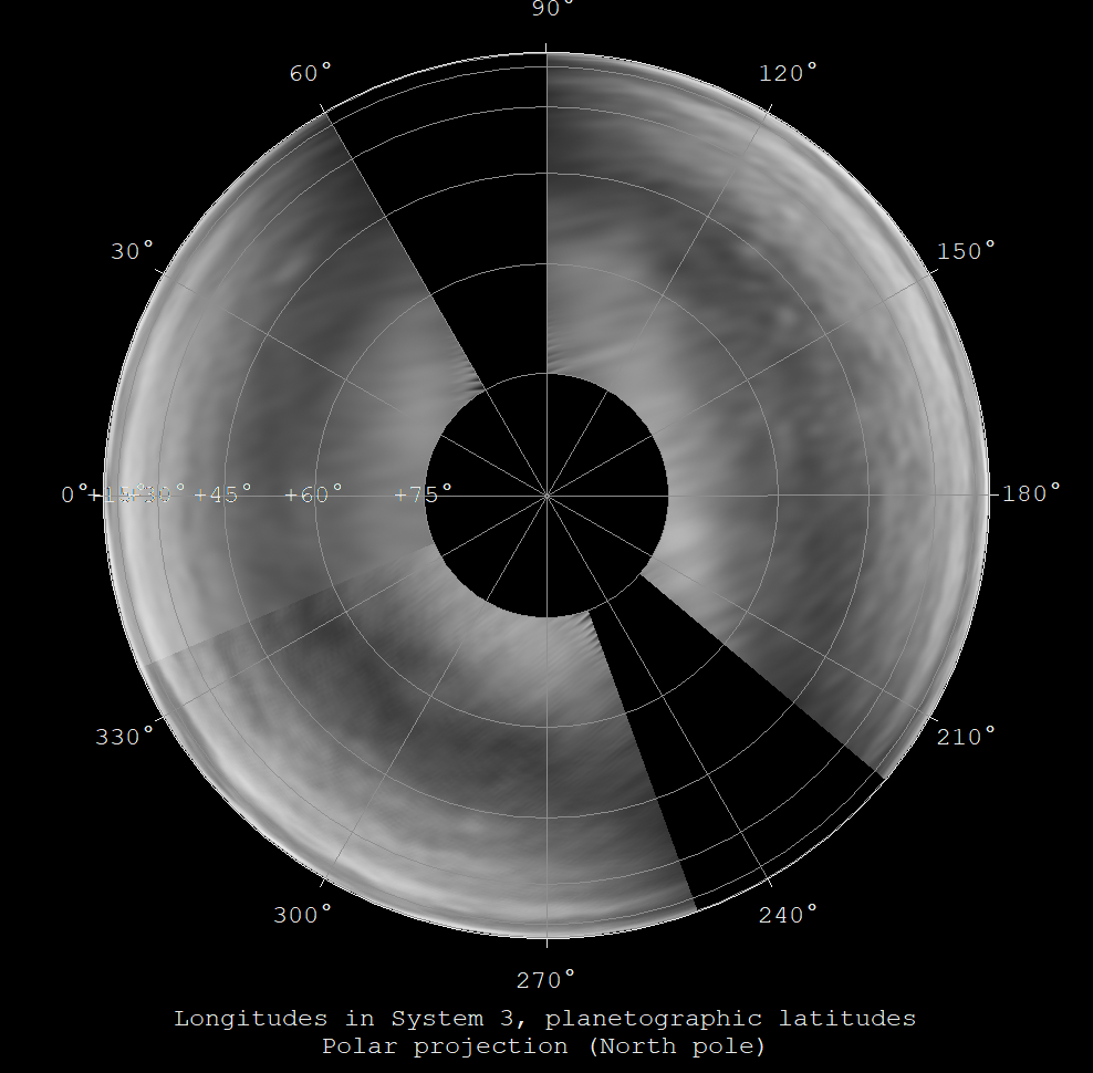North polar map in CH4 of images taken over two sessions, the first near 08h UT on 4th September (longitudes near the GRS), the second near 08h UT on 5th September (near 345 deg & PJ15)