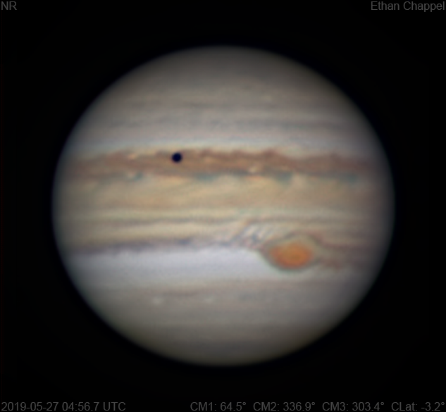 I wasn't expecting to image within the next week. However, I found Jupiter shining through a very thin cloud layer, so I hastily set up the C8 in a race against the clouds that were predicted to arrive at any moment. This was the first light of my new ZWO RGB filters, which I find to be much better than the Orion filters I was previously using with the this telescope. Notes: Io and its shadow is transiting the North Equatorial Belt. White Oval Z is directly north of the Great Red Spot. The Equatorial Zone is still orange. The southern edge appears to be finally losing its white color. The South Equatorial Belt appears to be split by a white zone. The southern edge of the belt appears more gray than brown. The Great Red Spot is highly sheared on the western edge. Another cloud sheared off the GRS a few days earlier is to the east of the storm.