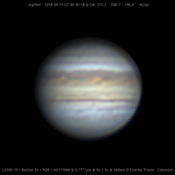 Jupiter 2019/08/19 (UT) 00:40:18 CM= 215.2°/ 208.1°/ 196.8° SCT LX200UHTC 254mm + Barlow 2x + RGB Filters + ASI174MM @ 0.17”/pixel (f/29) RGB: 3703/4572/2849 frames @ 43/54/34 fps @ 360sec S: 3/10 – T: 4/5 – Alt: 61° This is an RGB image under very poor seeing. Here we have had a bad weather for long time.