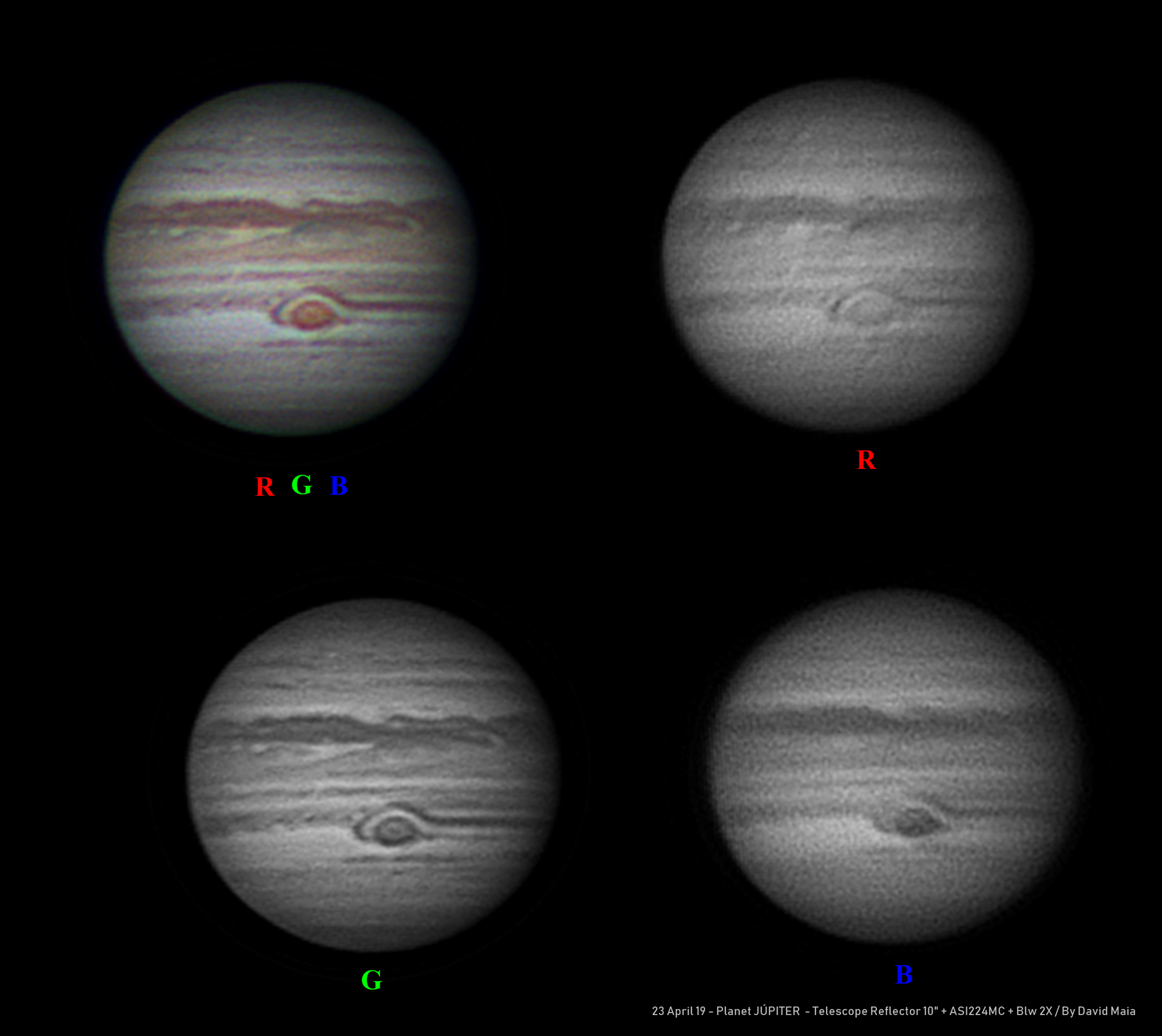 Jupiter registration in separate channel tone filters R (red) G (green) B (blue); By David Maia - (CDAORION - AfAEE)
