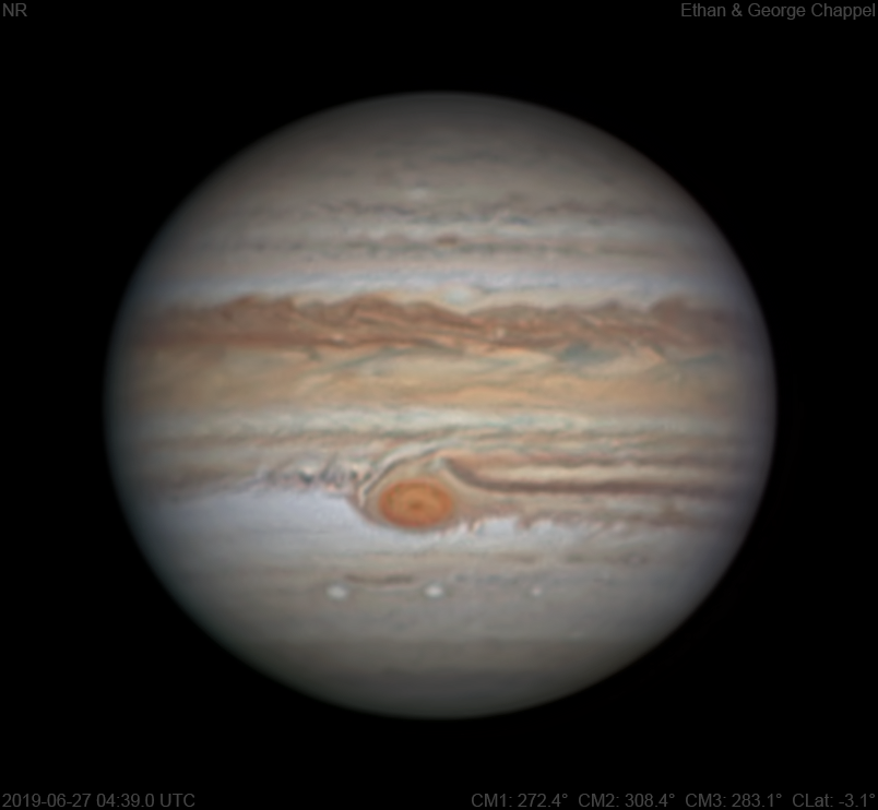 Despite the threat of clouds appearing soon in the weather forecast, we decided it was worth trying to beat them for an image. Turned out to be a good decision because seeing was quite good. Notes: White Oval Z has just passed the central meridian. Most of the Equatorial Zone is still orange The northern regions of the South Equatorial Belt are light in color. The Great Red Spot is at the central meridian. A small storm is on the northern edge of the darkened GRS hollow. Dark clouds from the GRS hollow appear to be entering the South Tropical Zone, with a wavy pattern on the southern edge.