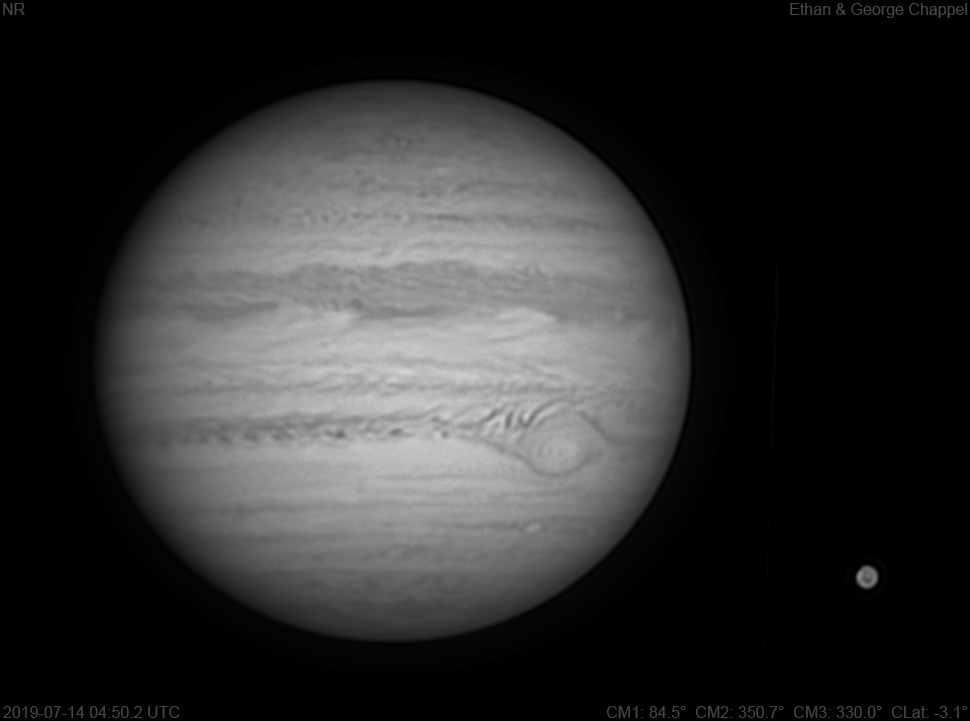 Finally, a night that wasn't too breezy for the CGEM DX and C14. I thought the seeing was only a little above average while recording, but it turned out to be excellent. Notes: The EZs has a dark northern border separating it from the rest of the zone. The SEBn trailing the GRS is light. The SEBs is dark and clumpy. White Oval Z is about to set. The faint STB Spectre is 48,000 km long. The eastern end is south of the GRS. Ganymede is presenting its Jovian-facing hemisphere, with the bright Tros impact crater near the western limb.