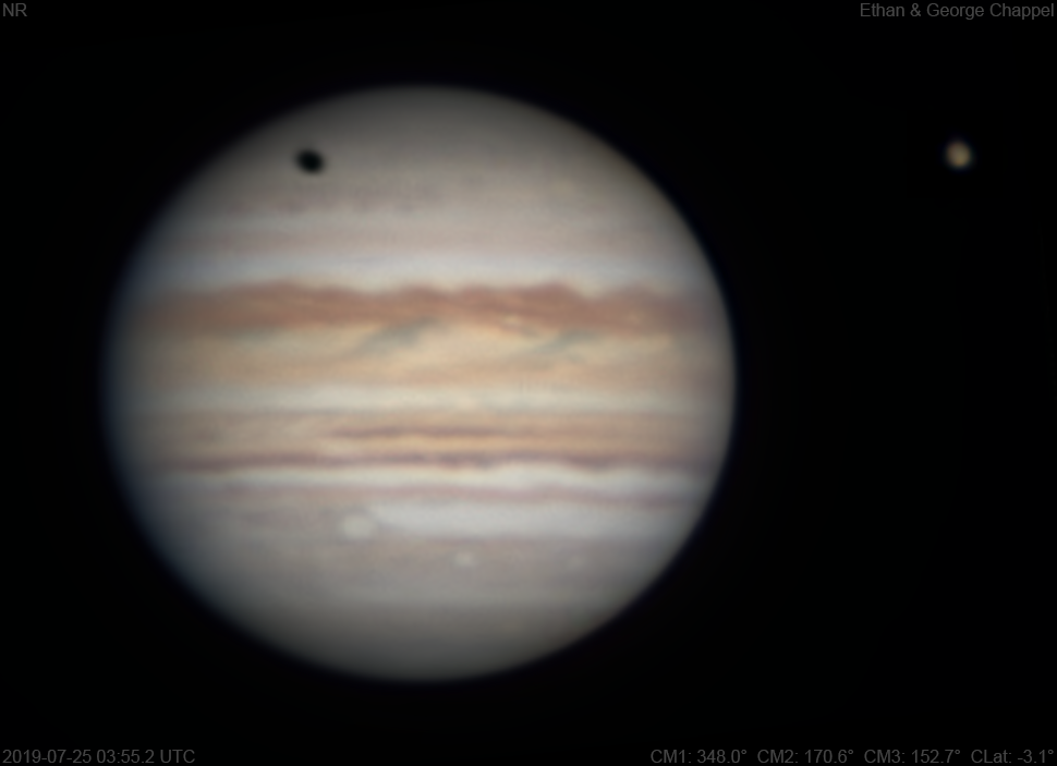 Less windy conditions allowed us to use the CGEM DX/C14 for the first time in nine days. Seeing was worse than most other nights this summer. Notes: The Equatorial Zone is still orange. Oval BA is approaching the central meridian. The South Polar Red Spot appears pale. Ganymede is showing a few surface details despite the low resolution. Osiris is visible as a bright region in the southern hemisphere. Ganymede's shadow is crossing the northern hemisphere.