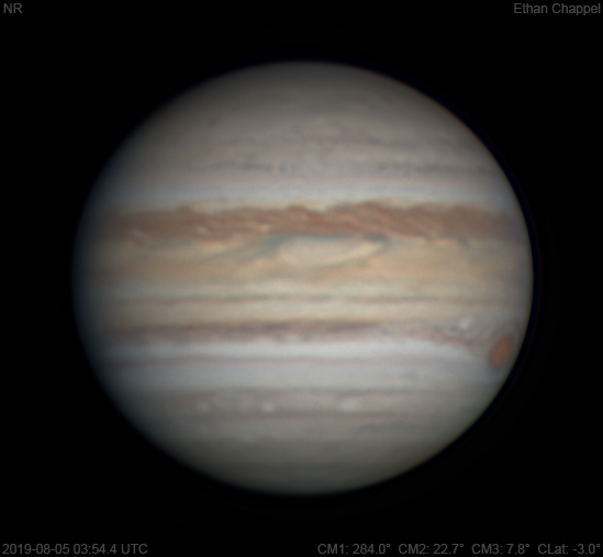 A night of decent conditions to start off imaging in August. Notes: The North Equatorial Belt has a few rifts. The Equatorial Zone is orange. The SEBn is unusually light. The SEBs is unusually dark. The Great Red Spot is setting. The GRS wake has a new outbreak.