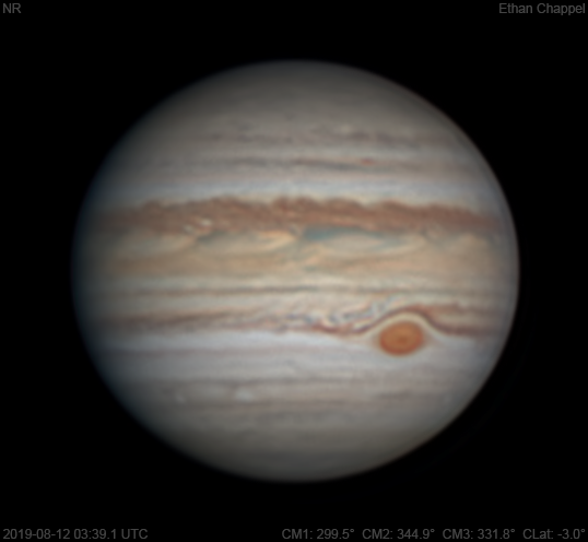Relatively nice seeing and transparency compared to the high bar set in the past few months. The same hemisphere from five days earlier is visible. No scar from that day's impact is visible. Notes: The North Equatorial Belt has a new rift approaching the central meridian. The Equatorial Zone is orange and has a few large festoons stretching westward. The GRS wake appears calmer than five days ago. The western end of the STB Spectre is at the central meridian. Although difficult to see, the system stretches far to the east.