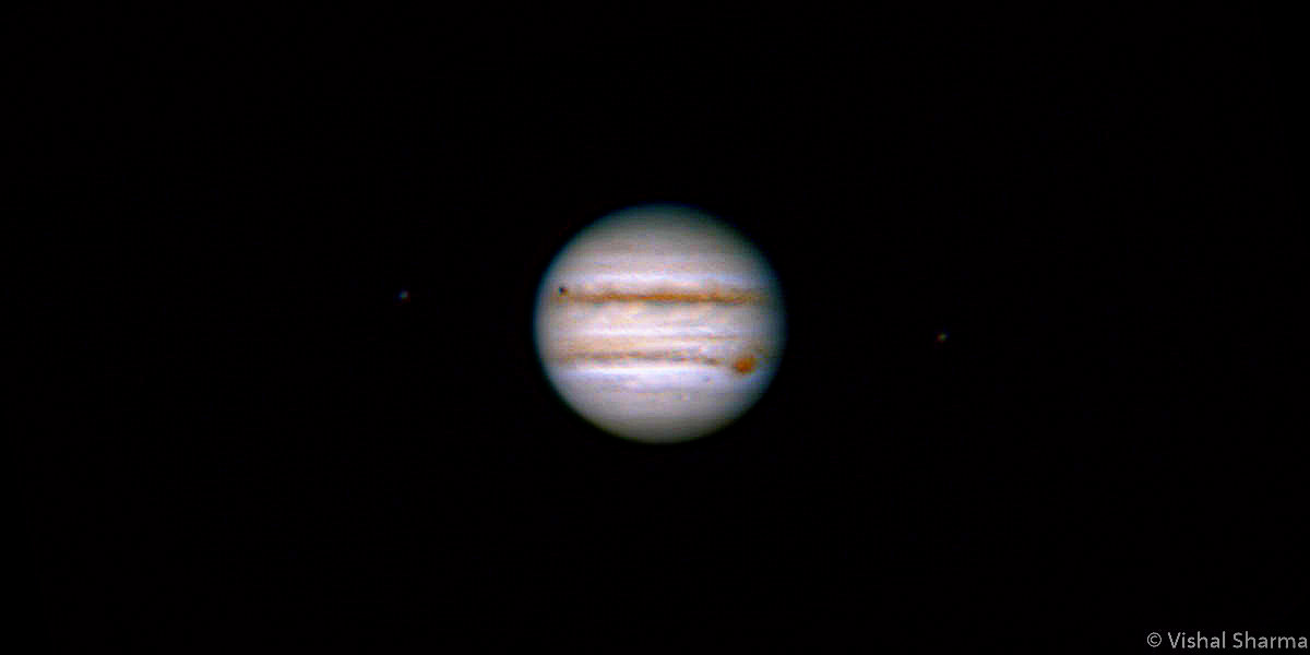 The Great Red Spot (GRS) is a persistent high-pressure region in the atmosphere of Jupiter, producing an anticyclonic storm, the largest in the Solar System, 22 degrees south of Jupiter's equator. →Shadow of Europa can be seen on its left side, above the North Equatorial Belt. Equipments:- __Celestron 127mm MAK, __iOptron MiniTower GoTo Mount, __Nikon D7100 __Celestron 2x Barlow Location:- Ajnara Le Garden Society, Home Balcony, Noida Extension, UP, India Date- 2020-06-01