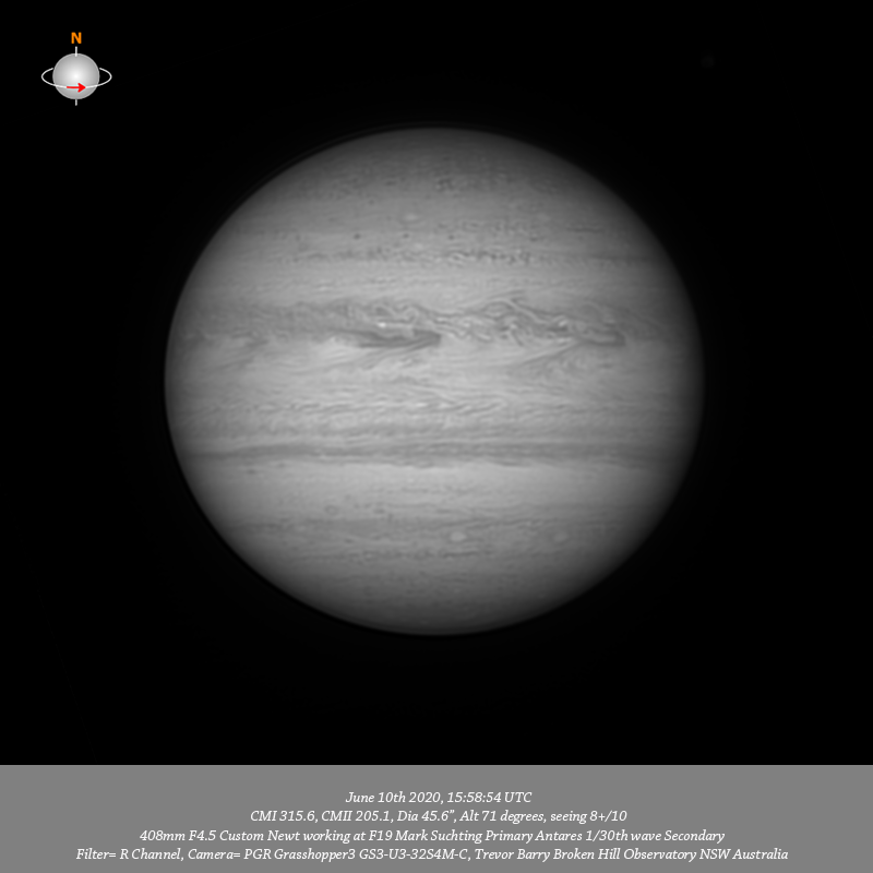 R channel data, very good seeing, stacked 90% of all R channel frames, exceptional depth of detail from pole to pole & limb to limb.