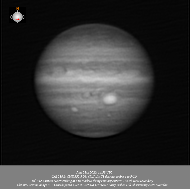 Imaged Jupiter June 28th in good seeing but initially poor transparency with all of the Ch4 and some of the 685nm IR data captured through cloud which was moving through quite quickly. That said the 685nm IR data is very good with an excellent depth of quite intricate detail resolved pole to pole and limb to limb. The NEB has considerable fine structure resolved in it while the fine structure resolved within the EZ is exquisite. The SEB structure following the GRS looks particularly interesting, circulation within the GRS is seen and the GRS chimney is open. Two tiny dark spots below and to the F side of the GRS are well resolved as is the dark elongated spot below the GRS in the STZ. Oval BA is well resolved as is the zigzag structure following it. Two small dark spots are seen below Oval BA with one leading and the other trailing it; a small bright oval is well resolved in the SSTB below the GRS. The R, G & B data was not affected by cloud, the R channel resolves all detail described for the IR as does the RGB data other than for the very fine structure seen in the EZ in the IR & R data. Regards Trevor