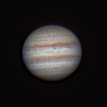 A shot of Jupiter taken from London. Image made from a 1000 video shot with a ZWO 120ASI MC camera on a Celestron 127 SLT telescope. Processed in PIPP and Registax. Jupiter quite high in clear sky but some haze and cloud on horizon.