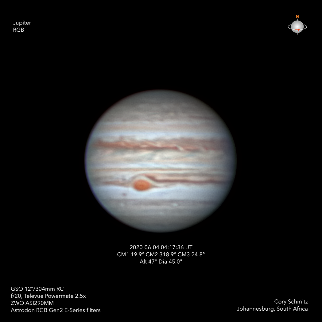 Jupiter and the GRS in RGB, June 4, 2020
