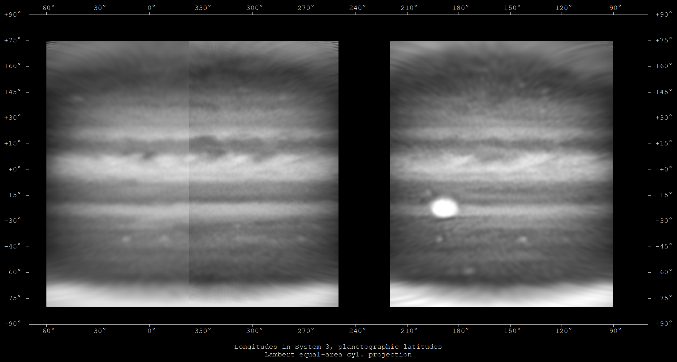 Equirectangular map in CH4 of images taken over two sessions, the first near 08h UT on 4th September (longitudes near the GRS), the second near 08h UT on 5th September (near 345 deg & PJ15)