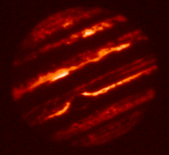 5.10-micron filtered image of Jupiter taken by the staff of NASA's Infrared Telescope Facility (IRTF) using the guide camera of the SpeX facility infrared spectrometer as a part of a program to characterize atmospheric variability in Jupiter to support the Juno mission. This filter is sensitive to very little sunlight reflected from clouds, but mostly to thermal emission from clouds as deep or deeper than the 2-3 bar pressure level. Image taken through cirrus.