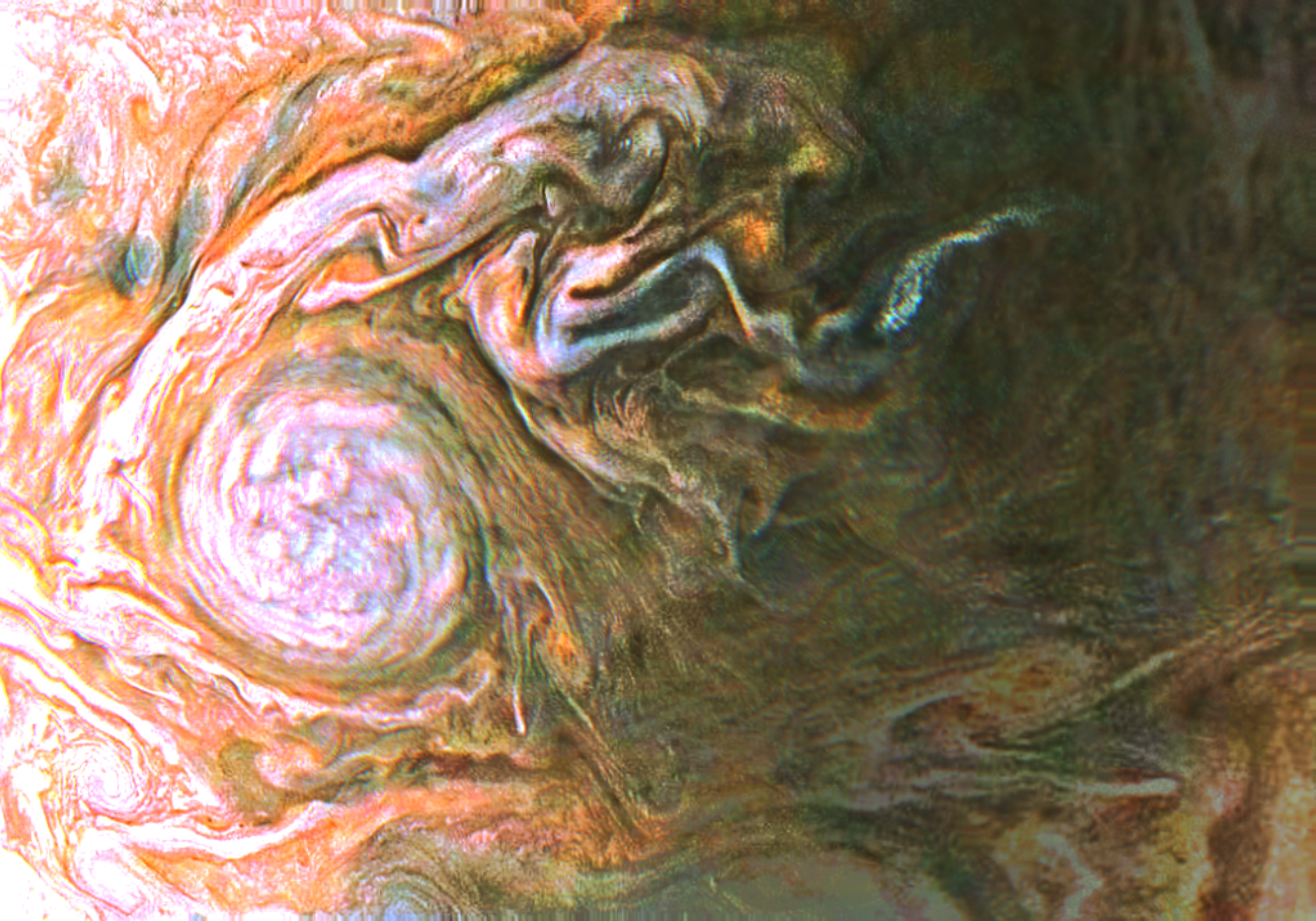 Junocam pixels are 12 bits deep from the camera but are converted to 8 bits inside the instrument using a lossless "companding" table, a process similar to gamma correction, to reduce their size. All Junocam products on the missionjuno website are in this 8-bit form as received on Earth. Scientific users interested in radiometric analysis should use the "RDR" data products archived with the Planetary Data System, which have been converted back to a linear 12-bit scale.