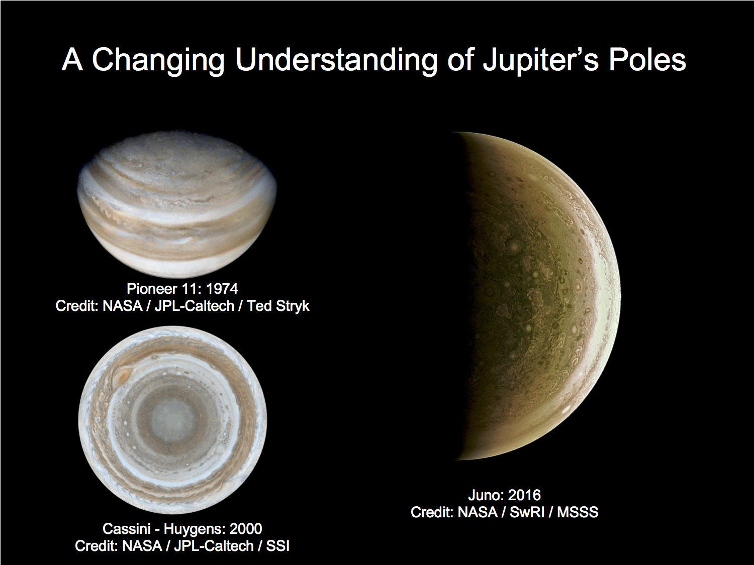 This montage combines images from the several NASA spacecraft that have flown over the poles of Jupiter: Pioneer, Cassini, and Juno. This image highlights the increases in image resolution with each successive flyby and the changing meteorology of Jupiter's clouds. You can see how the historic accomplishment of Juno, which has returned the sharpest images of the poles to date. Of course, this, along with all of my other creations, are dedicated to the wonderful teams who have made these missions possible and the great JunoCam image processing community!