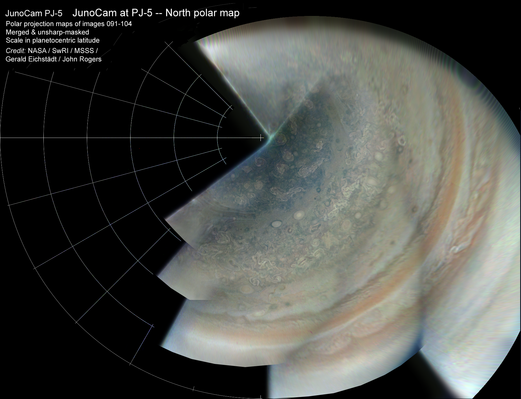 Gerald Eichstädt has now produced true polar projection maps from the JunoCam images, which enable us to locate features accurately. This is a composite of the north polar projections, merged to cover the maximum range of longitudes. --John Rogers.