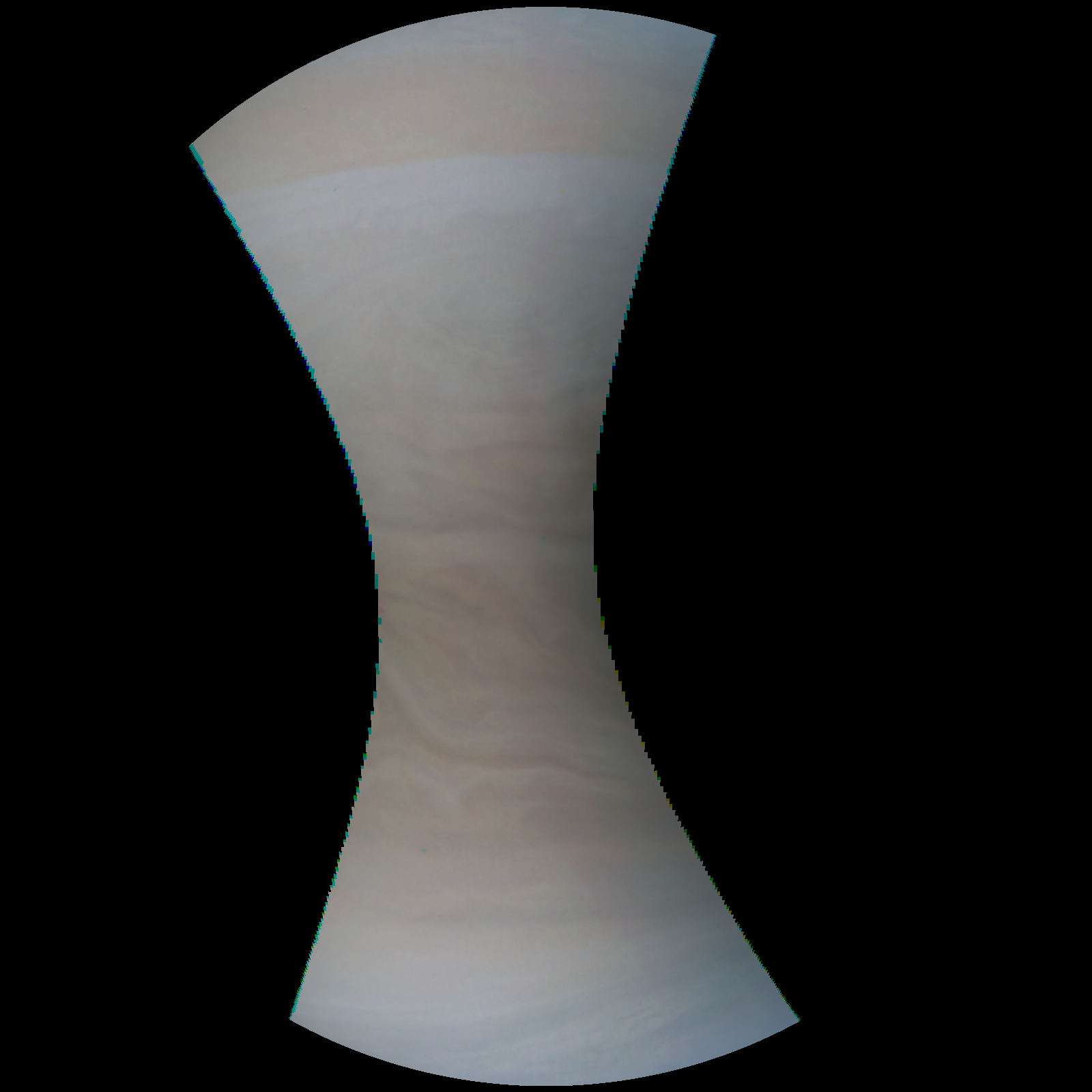 Junocam pixels are 12 bits deep from the camera but are converted to 8 bits inside the instrument using a lossless "companding" table, a process similar to gamma correction, to reduce their size. All Junocam products on the missionjuno website are in this 8-bit form as received on Earth. Scientific users interested in radiometric analysis should use the "RDR" data products archived with the Planetary Data System, which have been converted back to a linear 12-bit scale.