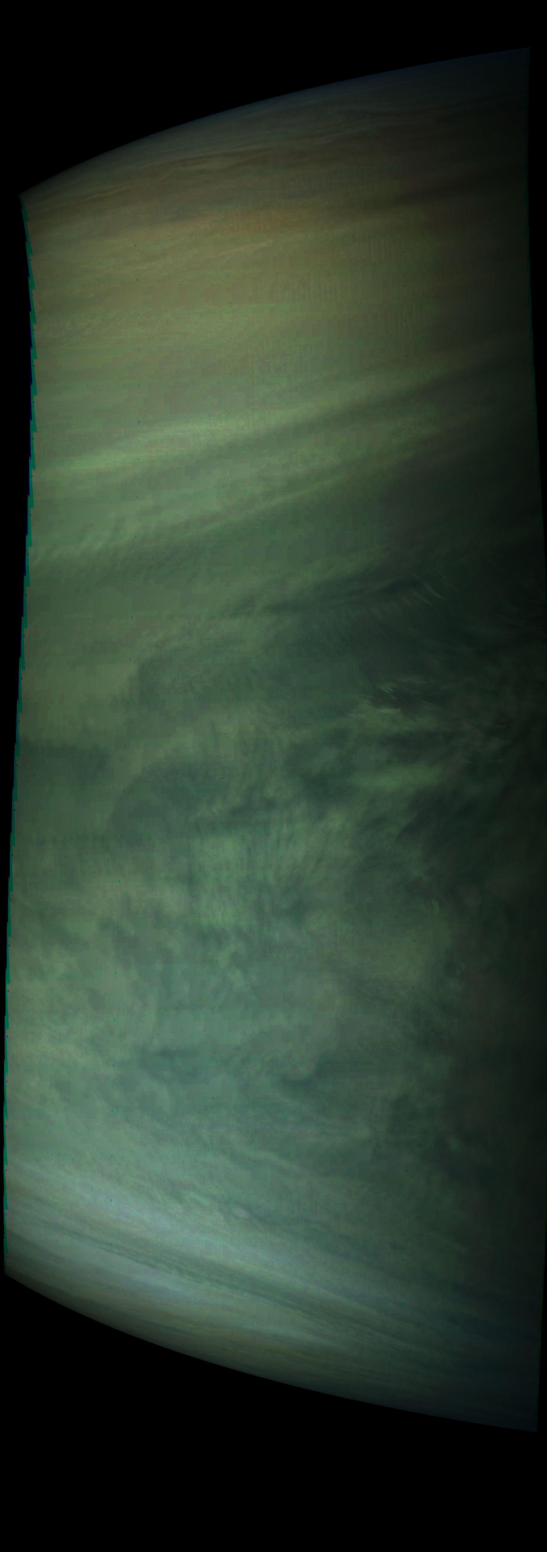 The image is mostly illumination adjusted, then strongly enhanced by using the 4th power of radiometric data. Then some illumination effect is added again in order to recover the 3D appearence. The resolution of the image is similar to JunoCam's resolution.