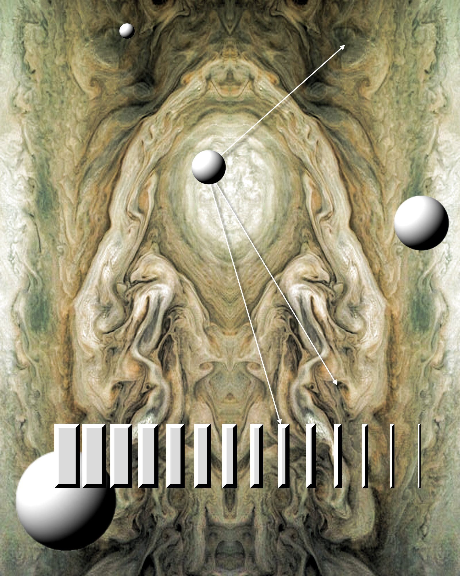 Manipulation of the downloaded Jovian cloud tops into partial symmetrical segments. Added Geometric symbols of several spheres in variable scales. Grounded into a vertical composition & the addition of horizontal grounding elongated rectangles. Connected 3 arrows as attention-getting directional symbols. Retained the original hues of the original.