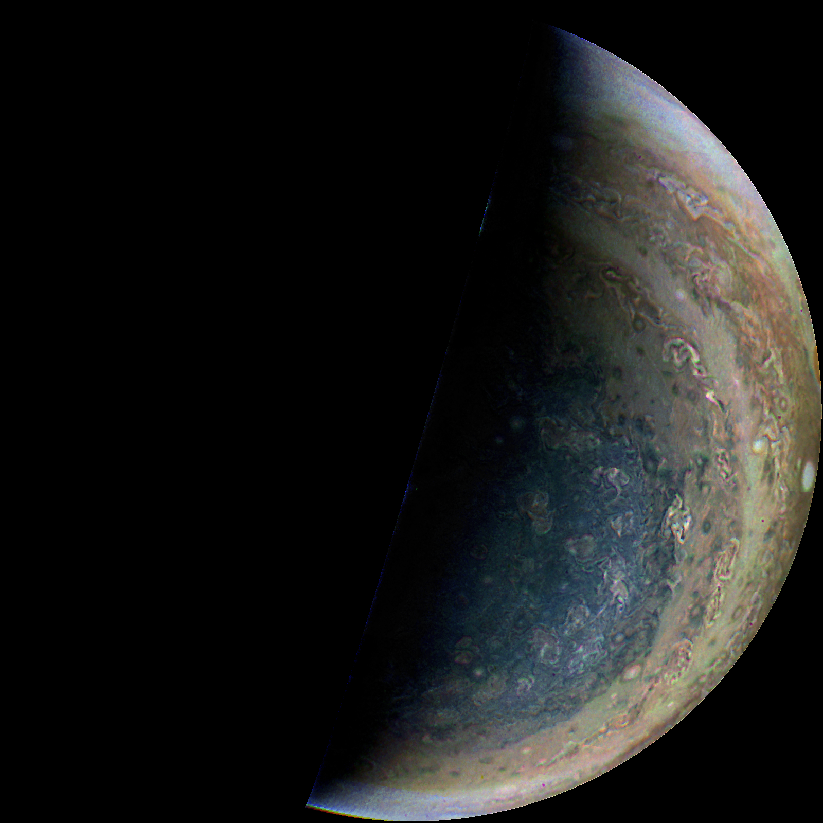 Junocam pixels are 12 bits deep from the camera but are converted to 8 bits inside the instrument using a lossless "companding" table, a process similar to gamma correction, to reduce their size. All Junocam products on the missionjuno website are in this 8-bit form as received on Earth. Scientific users interested in radiometric analysis should use the "RDR" data products archived with the Planetary Data System, which have been converted back to a linear 12-bit scale.