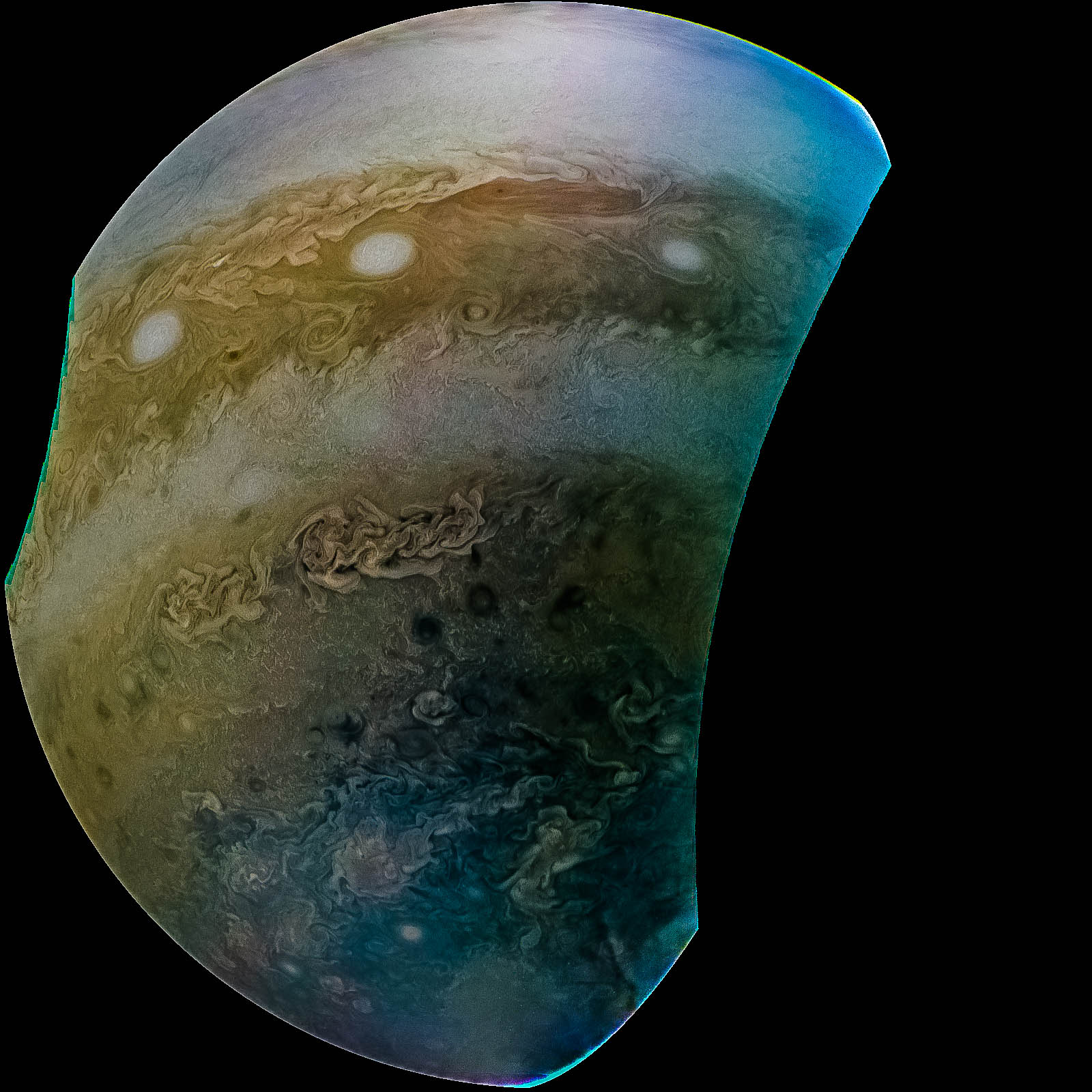 Junocam pixels are 12 bits deep from the camera but are converted to 8 bits inside the instrument using a lossless "companding" table, a process similar to gamma correction, to reduce their size. All Junocam products on the missionjuno website are in this 8-bit form as received on Earth. Scientific users interested in radiometric analysis should use the "RDR" data products archived with the Planetary Data System, which have been converted back to a linear 12-bit scale.