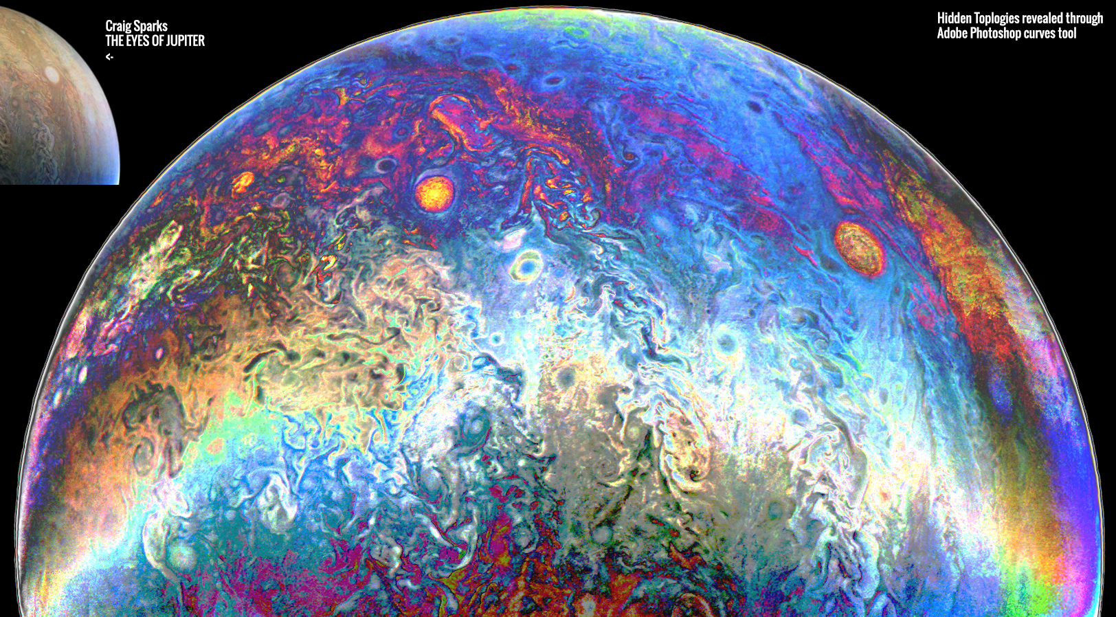 Photoshop Curves tool is a powerful way to reveal hidden topologies from layers. Use multiple settings to adjust the curve complexity, and iterate based on it revealing hidden topologies. Based on a processed image from JunoCam by Craig Sparks