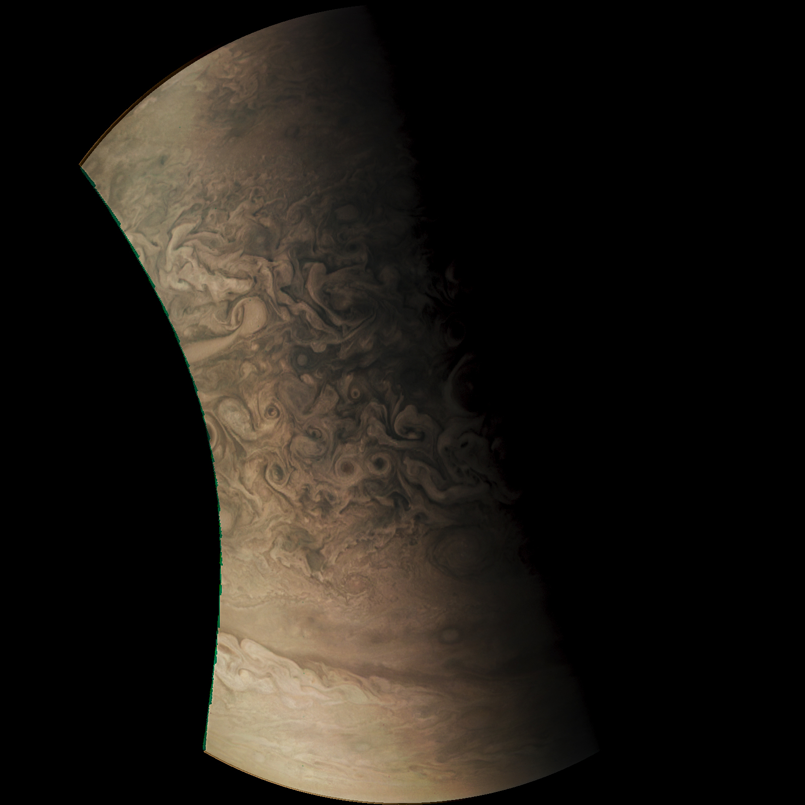Junocam pixels are 12 bits deep from the camera but are converted to 8 bits inside the instrument using a lossless "companding" table, a process similar to gamma correction, to reduce their size. All Junocam products on the missionjuno website are in this 8-bit form as received on Earth. Scientific users interested in radiometric analysis should use the "RDR" data products archived with the Planetary Data System, which have been converted back to a linear 12-bit scale.