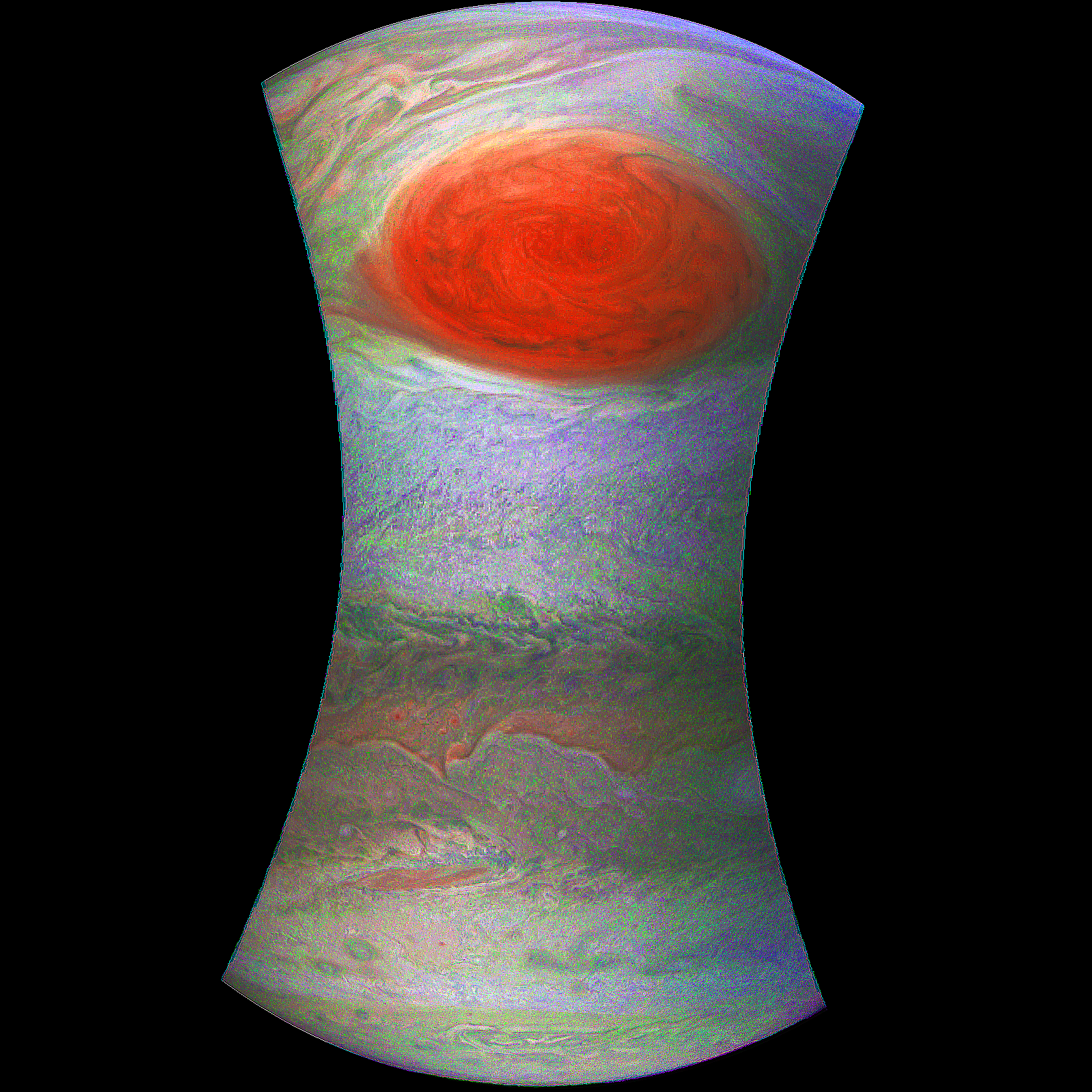 Junocam pixels are 12 bits deep from the camera but are converted to 8 bits inside the instrument using a lossless "companding" table, a process similar to gamma correction, to reduce their size. All Junocam products on the missionjuno website are in this 8-bit form as received on Earth. Scientific users interested in radiometric analysis should use the "RDR" data products archived with the Planetary Data System, which have been converted back to a linear 12-bit scale.