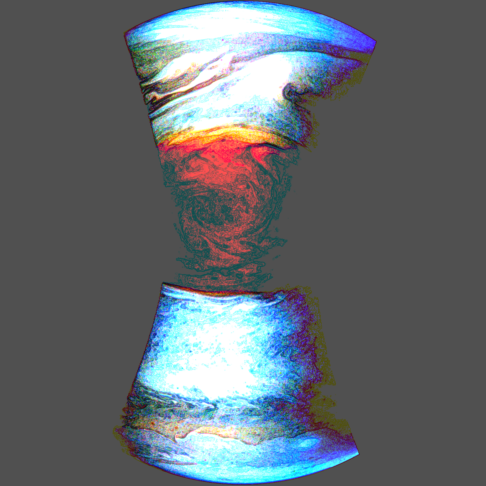 Junocam pixels are 12 bits deep from the camera but are converted to 8 bits inside the instrument using a lossless "companding" table, a process similar to gamma correction, to reduce their size. All Junocam products on the missionjuno website are in this 8-bit form as received on Earth. Scientific users interested in radiometric analysis should use the "RDR" data products archived with the Planetary Data System, which have been converted back to a linear 12-bit scale.