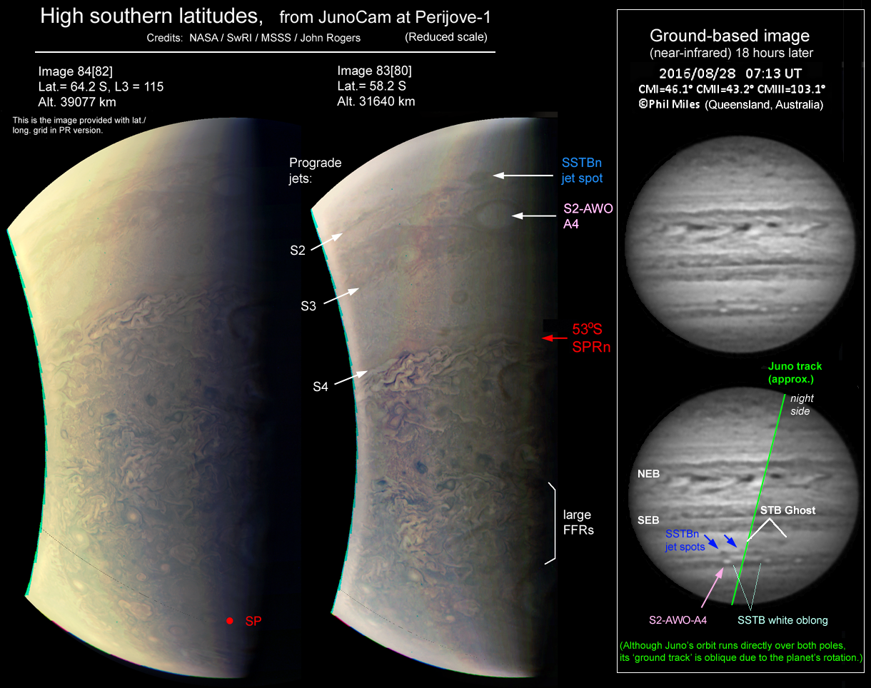 This pair overlaps with the images of the south pole in my previous post, and shows some of the huge FFRs (folded filamentary regions) at high latitudes. I have marked the positions of some of the known jets, and long-lived white oval A4 in the S2 domain. The accompanying ground-based image, taken by Phil Miles in Australia, shows the same features 18 hours later.