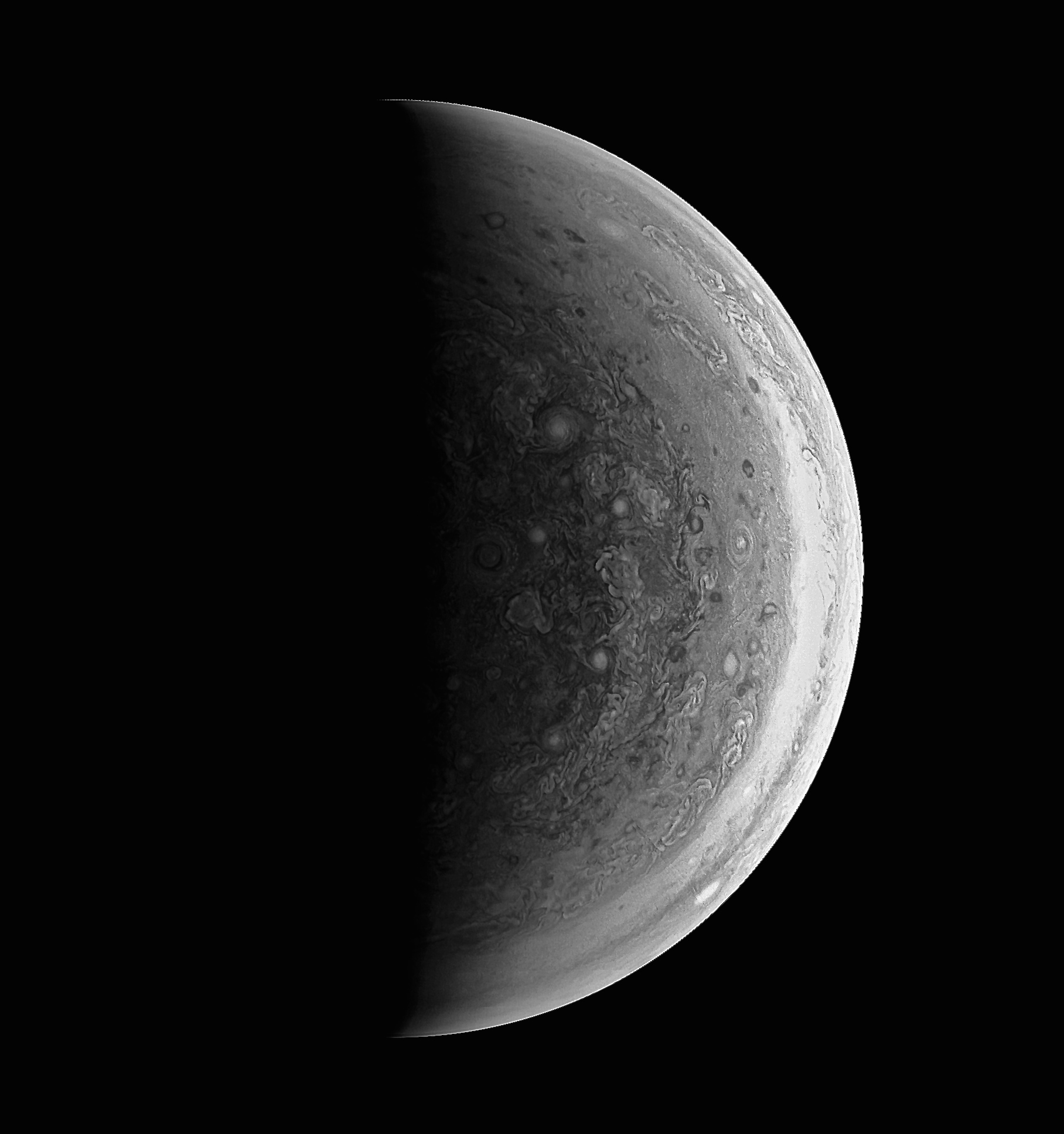 I used a filter to turn Juno's image of the north pole into monochromatic grey. This brings out the structure within some of the cyclones and waves in the turbulent upper atmosphere.