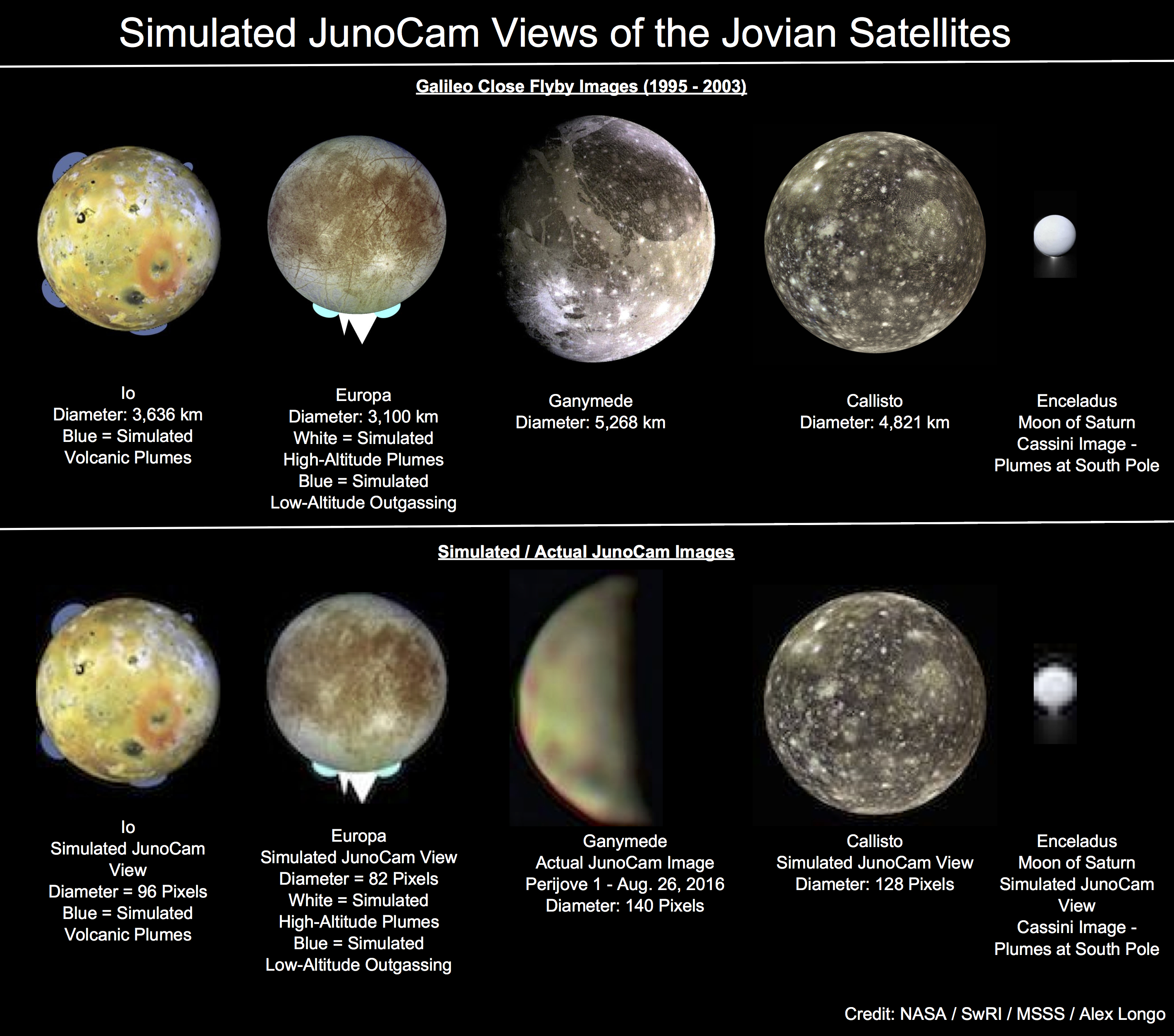 This collage was created to demonstrate the capabilities of JunoCam with regards to imaging the large Galilean satellites of Jupiter. Images acquired during close flybys of the Galileo orbiter past the moons are compared with simulated images by JunoCam from a distance. The Ganymede flyby on August 26th was used to calibrate the pixel sizes of the moons. Simulated volcanic plumes on Io and the two types of geysers seen on Europa are included in the images of these moons. It is readily apparent that JunoCam should be able to confirm the geysers of Europa, paving the way for future astrobiology missions! Images of Io will be useful for monitoring volcanic activity which has occurred since the New Horizons flyby in 2006. We should image these moons as much as possible to monitor changes on their surfaces, and with the approval of NASA, fly close to them to take high-resolution photos in an extended mission before the disposal of the spacecraft.