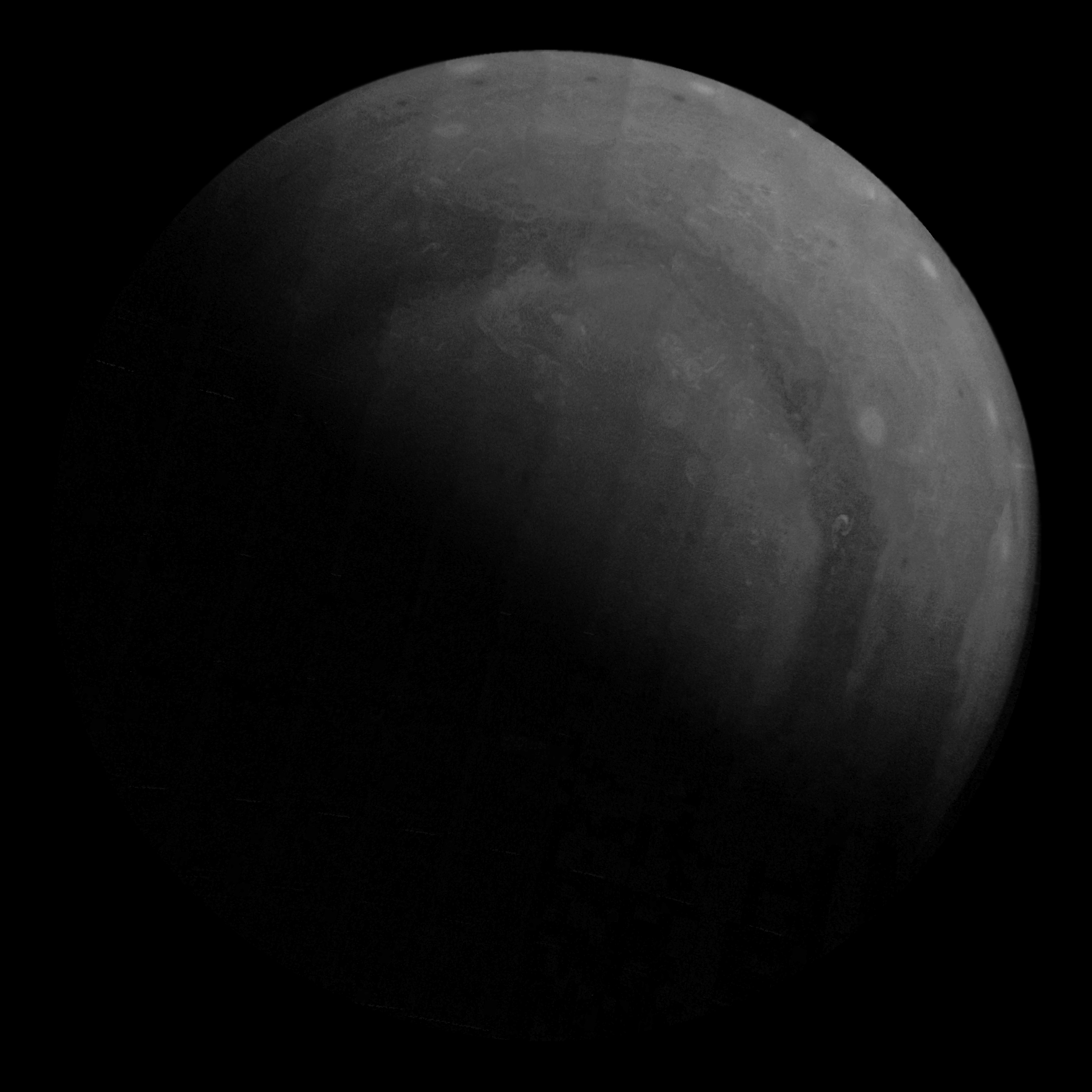 Junocam pixels are 12 bits deep from the camera but are converted to 8 bits inside the instrument using a lossless "companding" table, a process similar to gamma correction, to reduce their size. All Junocam products on the missionjuno website are in this 8-bit form as received on Earth. Scientific users interested in radiometric analysis should use the "RDR" data products archived with the Planetary Data System, which have been converted back to a linear 12-bit scale.
