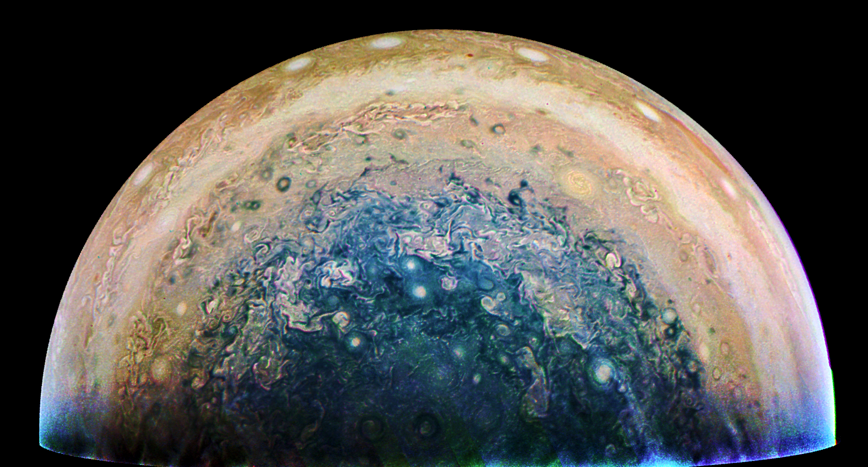 Junocam pixels are 12 bits deep from the camera but are converted to 8 bits inside the instrument using a lossless "companding" table, a process similar to gamma correction, to reduce their size. All Junocam products on the missionjuno website are in this 8-bit form as received on Earth. Scientific users interested in radiometric analysis should use the "RDR" data products archived with the Planetary Data System, which have been converted back to a linear 12-bit scale.