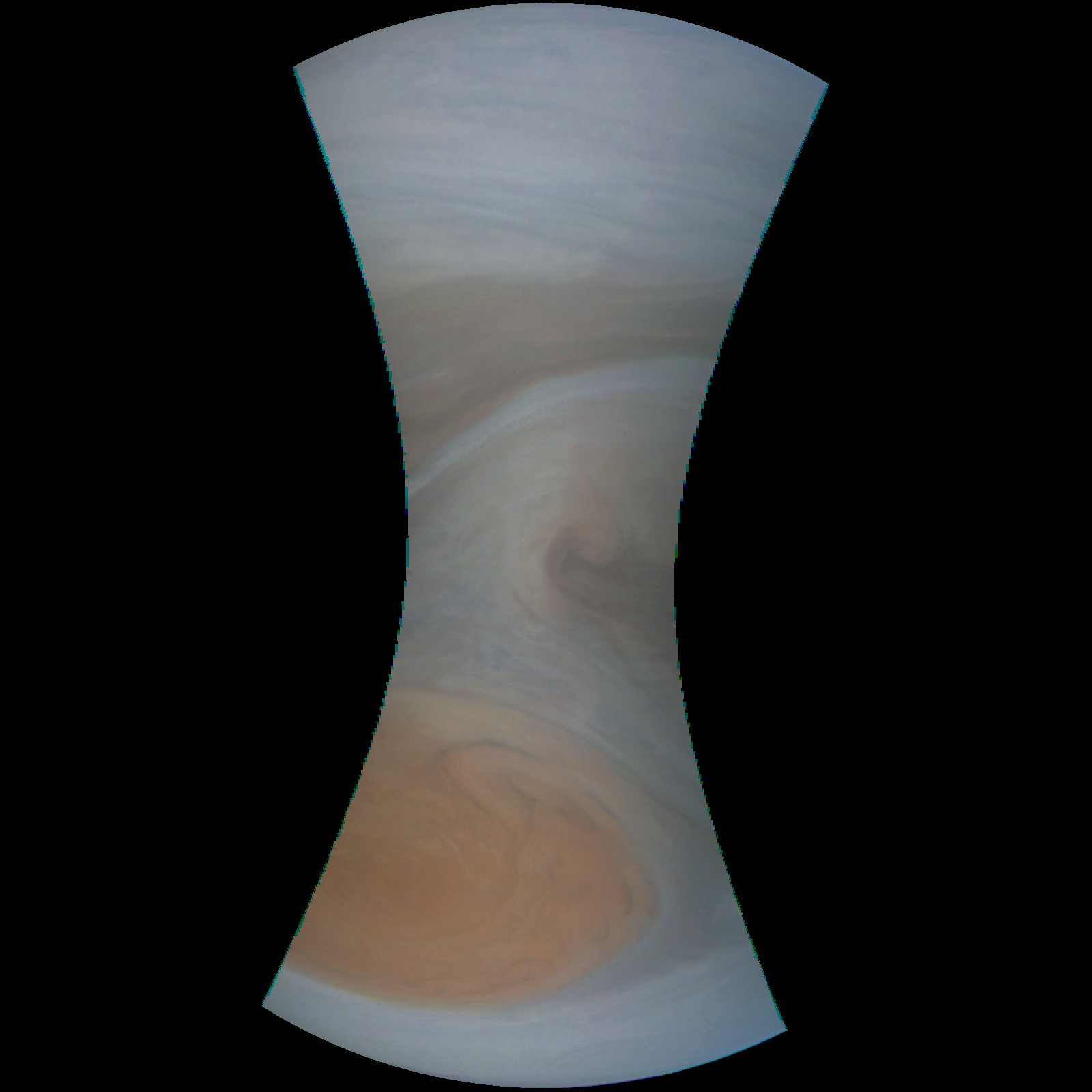 Junocam pixels are 12 bits deep from the camera but are converted to 8 bits inside the instrument using a lossless "companding" table, a process similar to gamma correction, to reduce their size. All Junocam products on the missionjuno website are in this 8-bit form as received on Earth. Scientific users interested in radiometric analysis should use the "RDR" data products archived with the Planetary Data System, which have been converted back to a linear 12-bit scale.