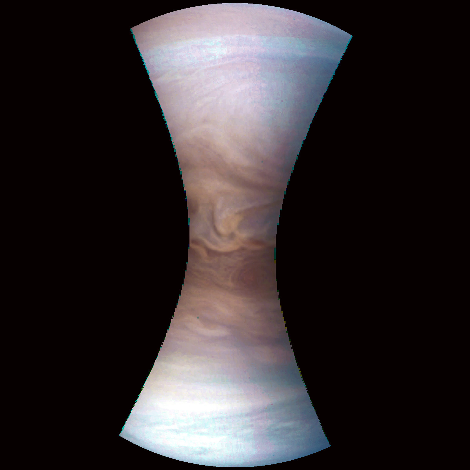 Junocam pixels are 12 bits deep from the camera but are converted to 8 bits inside the instrument using a lossless "companding" table, a process similar to gamma correction, to reduce their size. All Junocam products on the missionjuno website are in this 8-bit form as received on Earth. Scientific users interested in radiometric analysis should use the "RDR" data products archived with the Planetary Data System, which have been converted back to a linear 12-bit scale.