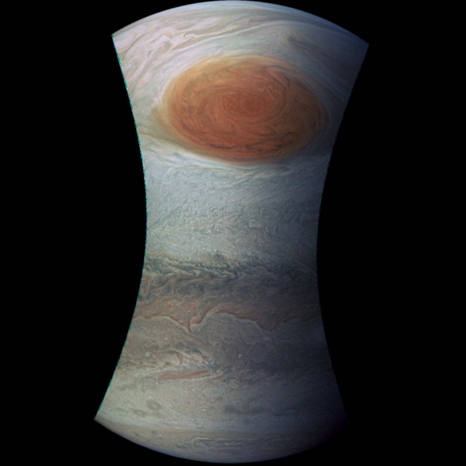 Junocam pixels are 12 bits deep from the camera but are converted to 8 bits inside the instrument using a lossless "companding" table, a process similar to gamma correction, to reduce their size. All Junocam products on the missionjuno website are in this 8-bit form as received on Earth. Scientific users interested in radiometric analysis should use the "RDR" data products archived with the Planetary Data System, which have been converted back to a linear 12-bit scale.