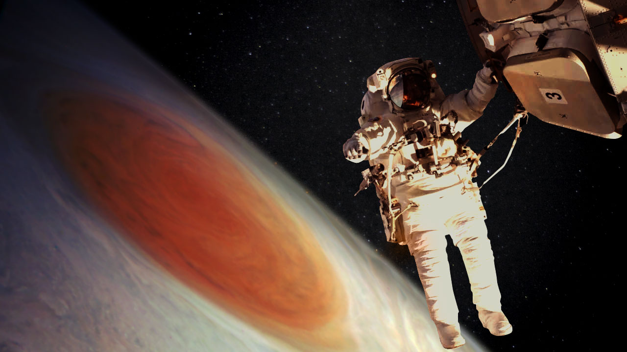 Space station maintenance above the Great Red Spot. This photomanipulation uses an image from JunoCam Perijove 7 and a photograph from the ISS – I think this image is of either Jeffrey Williams or Kate Rubins from ISS Expedition 48, but I'm not certain.