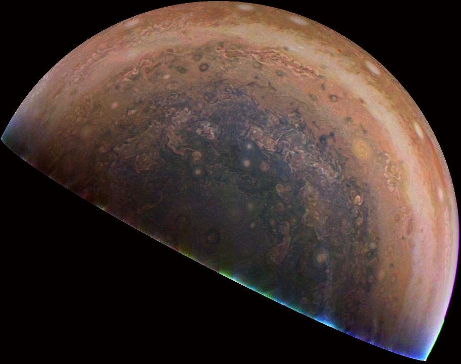 Junocam pixels are 12 bits deep from the camera but are converted to 8 bits inside the instrument using a lossless "companding" table, a process similar to gamma correction, to reduce their size. All Junocam products on the missionjuno website are in this 8-bit form as received on Earth. Scientific users interested in radiometric analysis should use the "RDR" data products archived with the Planetary Data System, which have been converted back to a linear 12-bit scale.